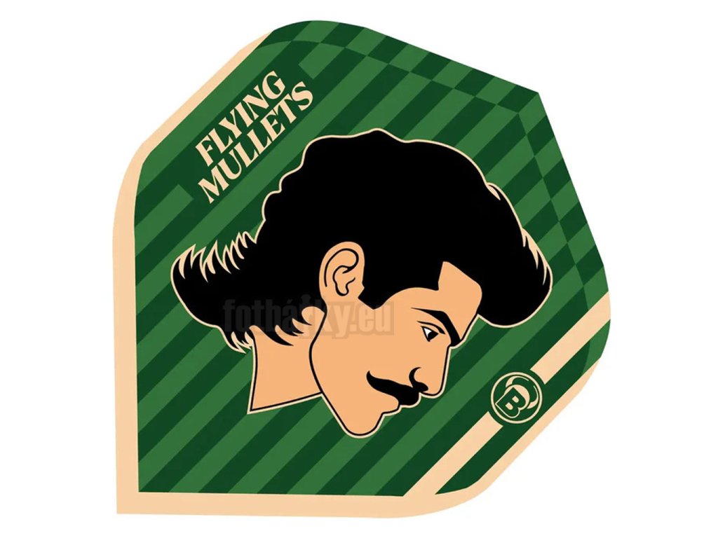 Letky Flying Mullet jsou zároveň výrazným stylovým doplňkem vašeho šipkového vybavení. Dominantním prvkem je charakteristická hlava z loga Flying Mullet s ikonickým účesem a knírkem, která okamžitě přitáhne pozornost.