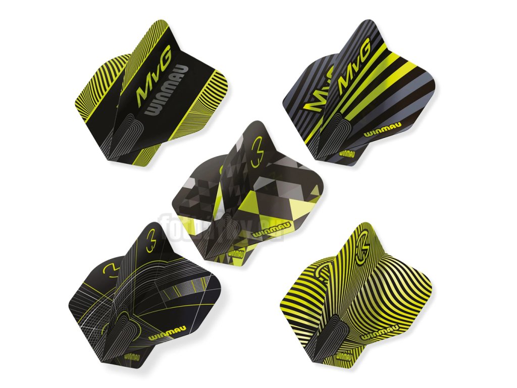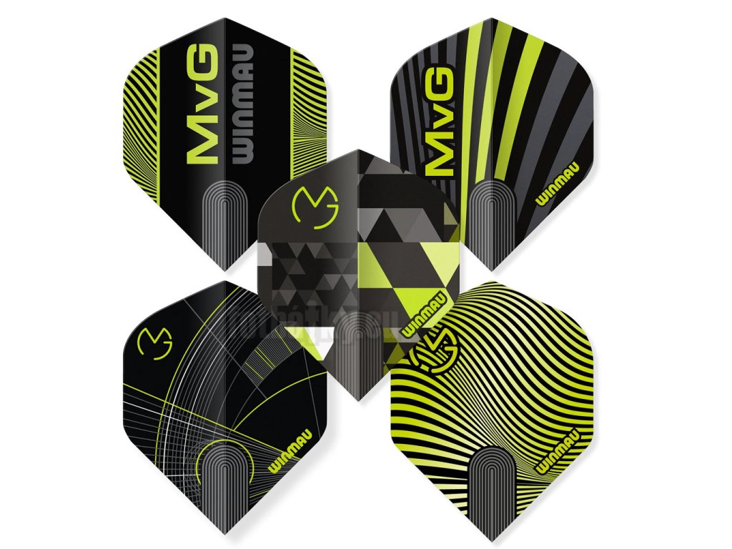 Každý ze 5 setů nabízí jiný výrazný vzor v zeleno-černé barevné kombinaci – MvG signature barvách, které fanoušci šipek znají z každého světového turnaje. Ať si vyberete jakýkoliv set, výsledek je vždy stejný: šipky na terči vypadají profesionálně a sebevědomě.