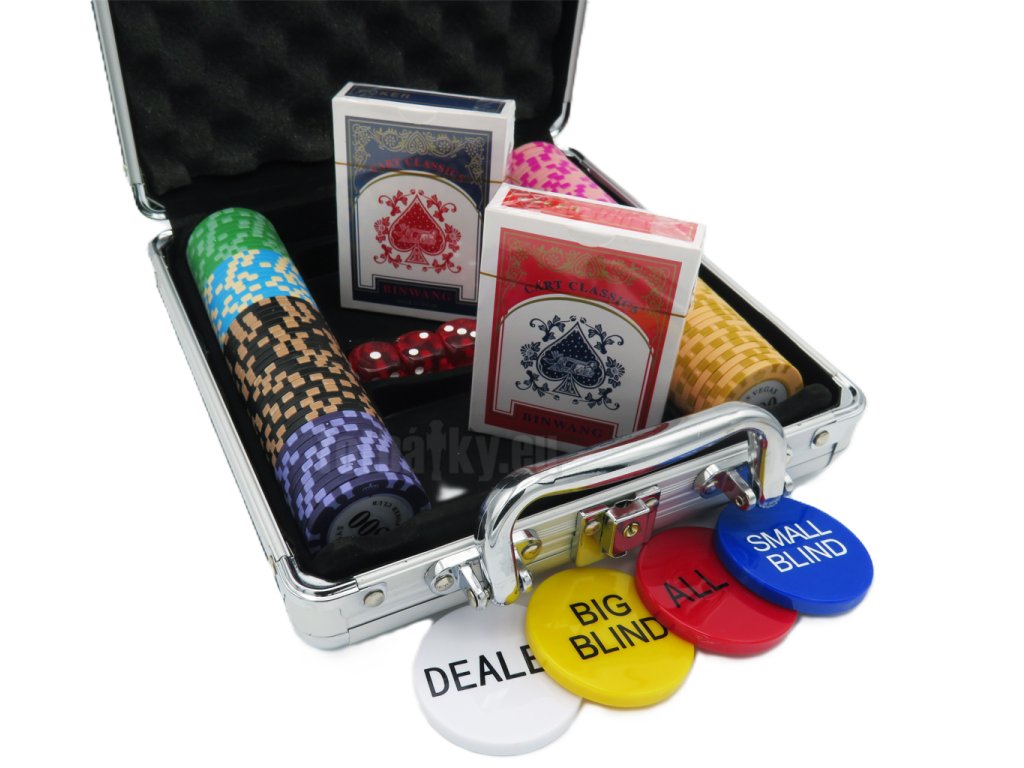 - Kompletní příslušenství : Sada obsahuje 2 balíčky 54 karet , 5 kostek a speciální žetony DEALER, ALL IN, SMALL BLIND a BIG BLIND pro pohodlné řízení hry.